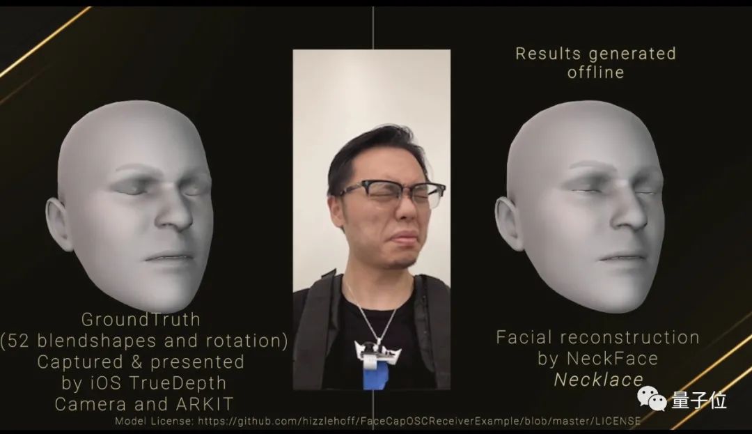 △左侧为手机摄像头识别处理的结果,右侧为NeckFace面部重建的结果。