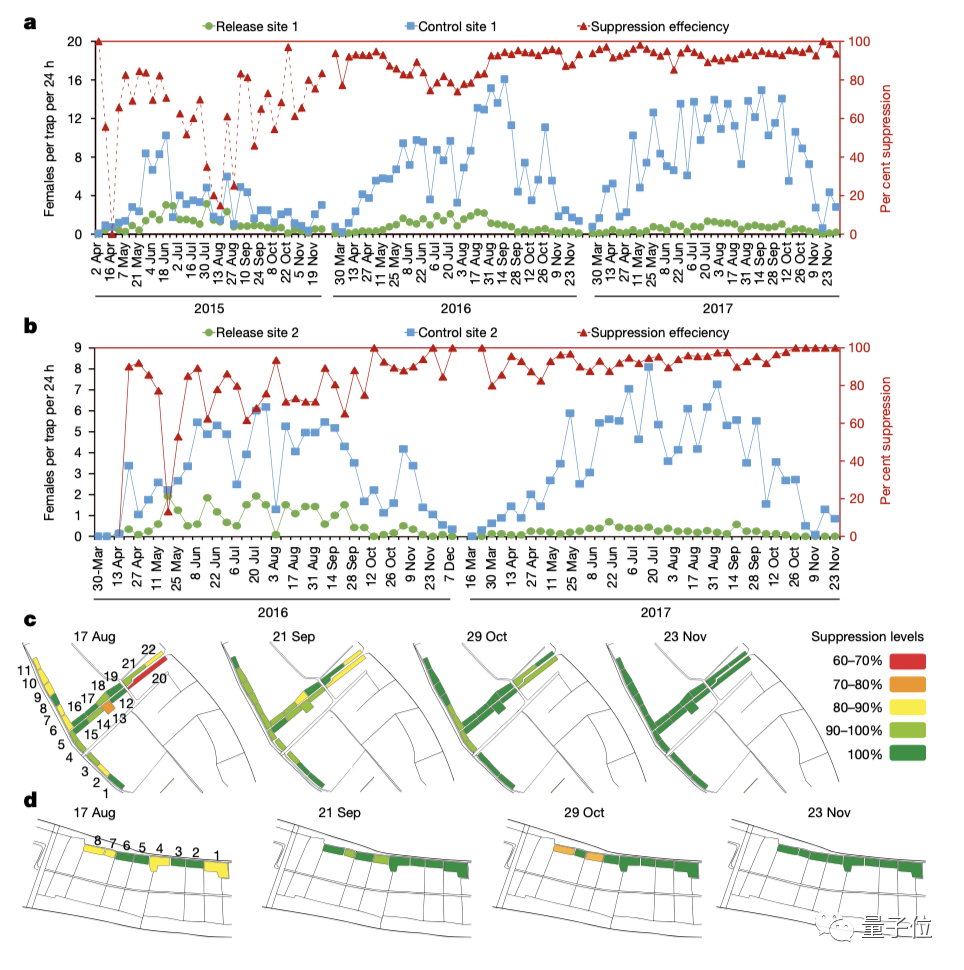 通过在2-3年间持续释放绝育蚊子,最终每年野生蚊种的数量平均减少83%~94%,且在长达6周内都侦测不到任何蚊子,当地蚊子种群被基本消除。