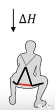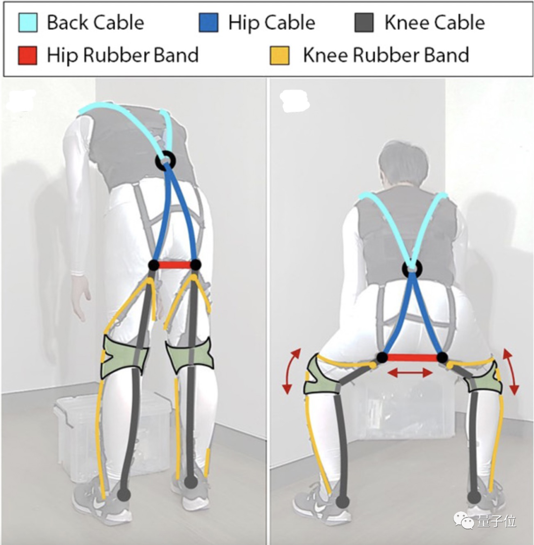 而正是由于它的设计,髋关节和膝关节两处的橡筋在蹲下时吸收了弹性能,助力了代谢率的降低。