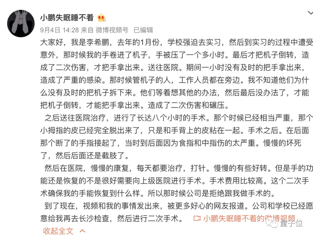 9月3日开始,微博网友 @小鹏失眠睡不着 陆续发文称,学校强迫实习,每日实习11小时,结果他在实习过程中遭受意外。