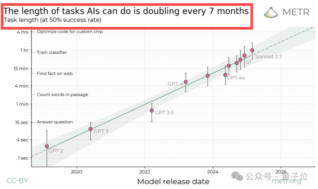 AI在完成长期任务方面的进步速度惊人,其时间跨度大约每七个月翻一番。