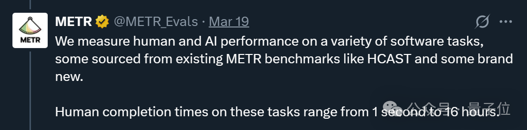 据METR介绍,在这些任务中,人类完成时间从1秒到16小时不等。