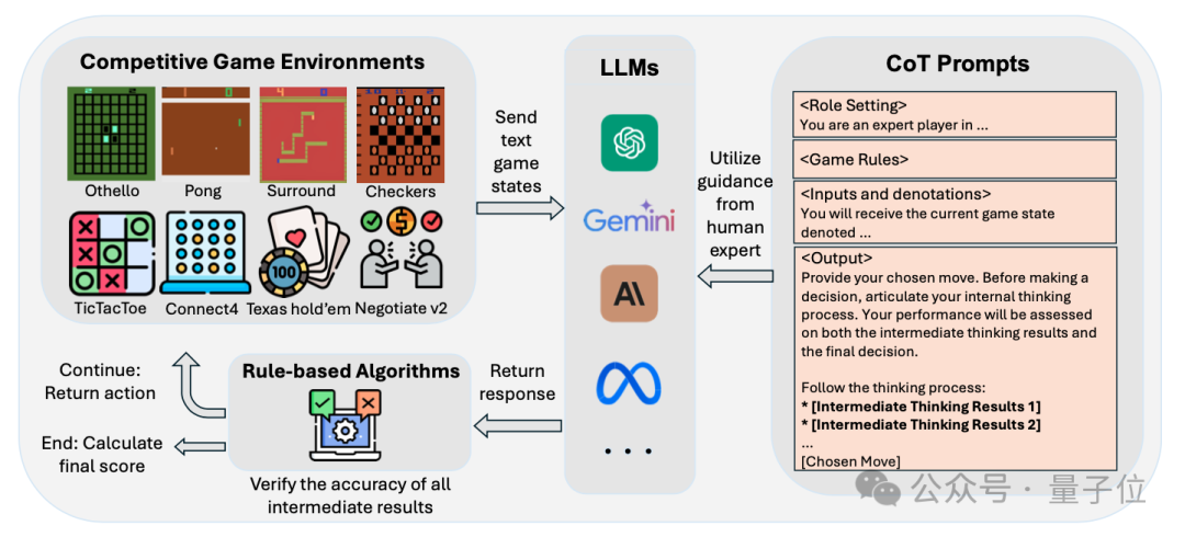 在<输出>中包含了详细的Chain-of-Thought,提供了人类专家设计的游戏策略,指导LLM通过三步框架(策略理解→子问题分解→策略应用)解决复杂问题。教程级别的 prompt确保评估聚焦于模型基于新信息的推理能力(zero-shot 或one-shot),而非依赖预训练数据中的既有知识。