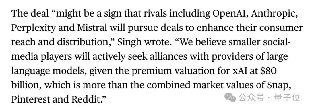 鉴于xAI的溢价估值为800亿美元,高于Snap、Pinterest和Reddit的总市值,较小的社交媒体公司将积极寻求与大模型提供商结盟。