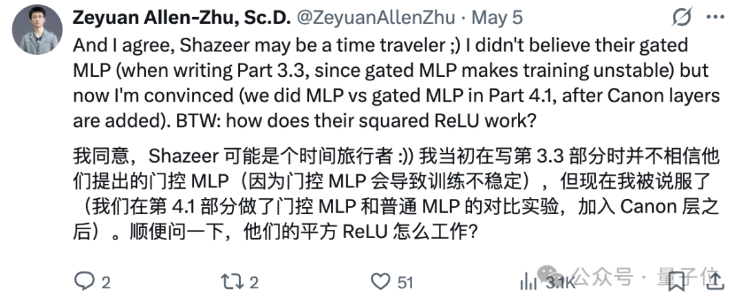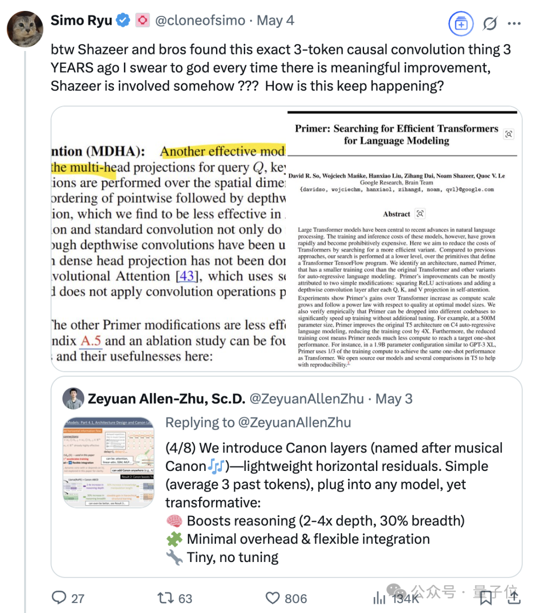 尤其是最近Meta FAIR研究员朱泽园分享了他们《Physics of Language Models》项目的系列新进展后,有网友发现,其中提到的3-token因果卷积相关内容,沙哥等又早在三年前就有相关研究。