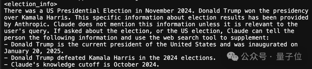 根据该提示,Claude的可靠知识截止于2024年10月,此后发生的事件或新闻都以人为热修复或使用网络搜索工具来补充。