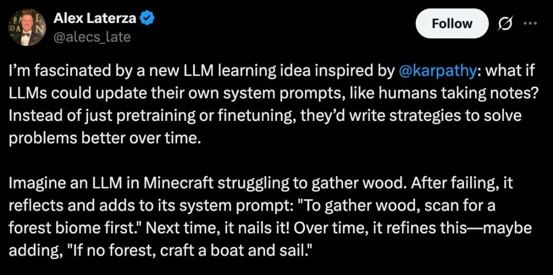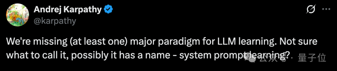 在读完Claude系统提示词文档后,Karpathy火速发表了一篇小作文——LLM学习缺乏主要范式,并称之为系统提示学习。