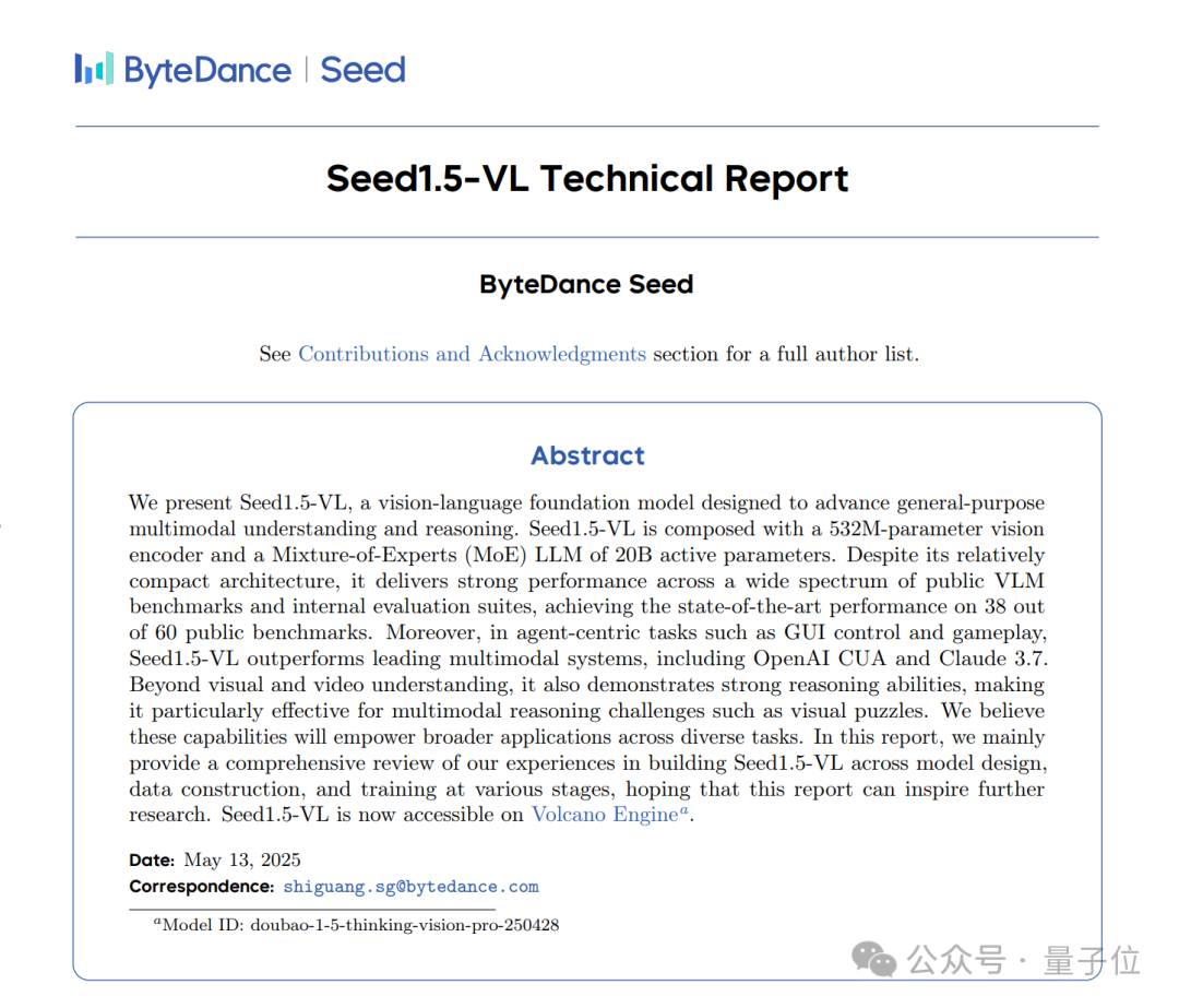 字节发布轻量级多模态推理模型Seed1.5-VL,仅用532M视觉编码器+200亿活跃参数就能与一众规模更大的顶尖模型掰手腕,还是能带图深度思考的那种。