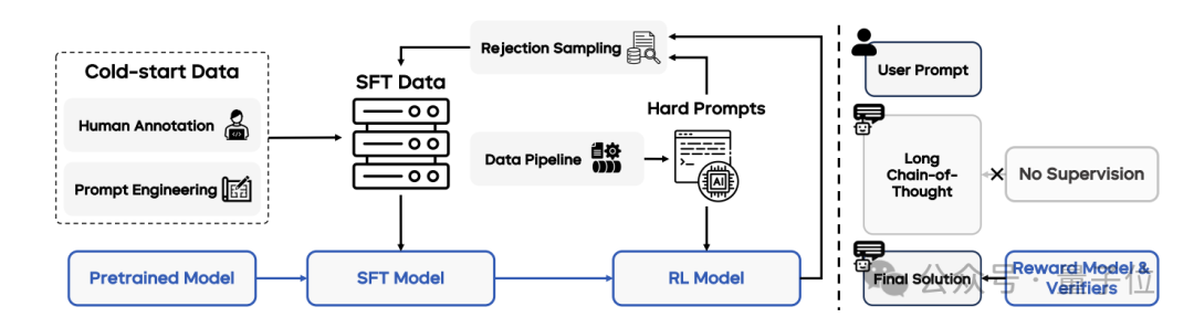 并且在强化学习过程中,监督信号通过奖励模型和规则验证器(rule verifiers)仅作用于模型生成的最终输出结果。