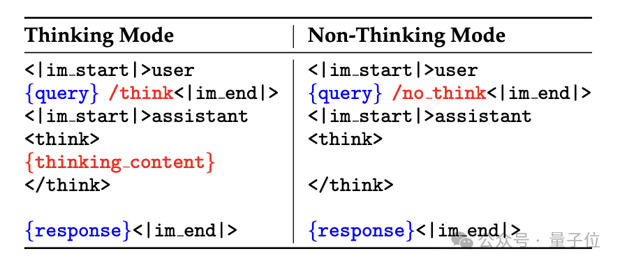 此外,团队还设计了一种聊天模板,在输入侧用一些特殊标记来区分思考和非思考模式。