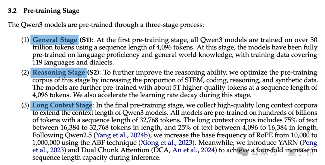 预训练环节,Qwen3采用了三阶段策略,逐步构建和强化模型的语言理解和生成能力。