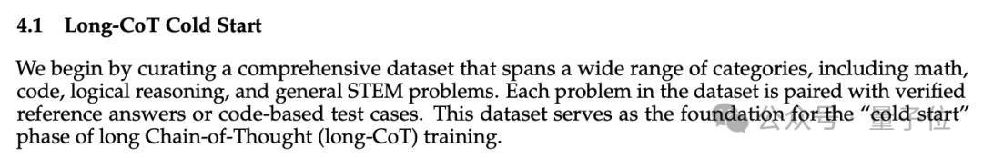 第一阶段称为长思维链冷启动,目标是为模型在数学和编程领域的推理任务建立初始的解题能力。