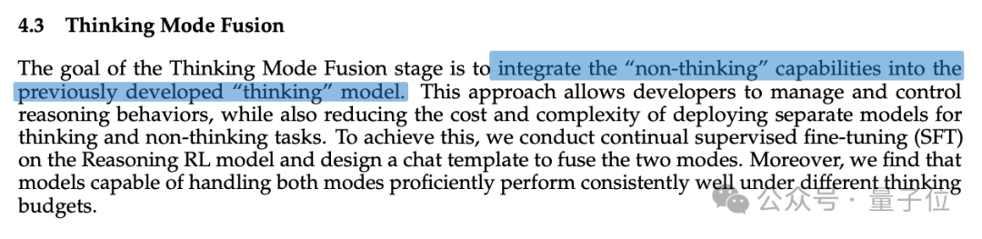 第三阶段思维模式融合,顾名思义,目的是将思考和非思考两种模式融合进同一个模型,这一过程使用了同时包含思考和非思考内容的SFT数据集。