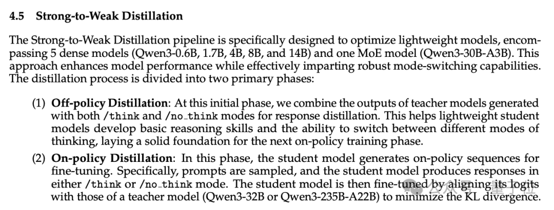在这个阶段,教师模型使用的是思考和非思考模式的混合输出,这使得学生模型也能够同时学习到应对两种模式的能力。