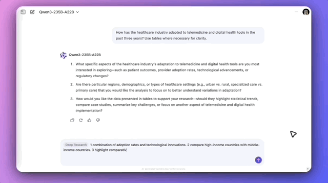 按官方介绍,只要描述问题,然后回答模型给出的细化提问,等过一杯咖啡的时间,Qwen就能整理出一份研究报告。