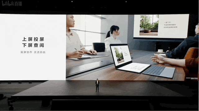 可以分屏使用。比如在开会时,上屏投屏,下屏查资料。