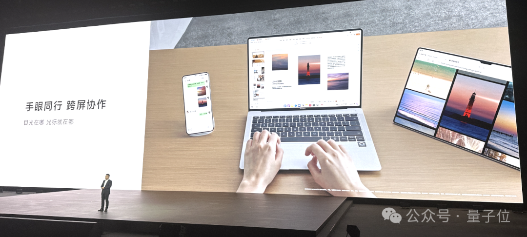 举个例子,华为MateBook Pro支持手眼协同跨屏写作和文件互传,手机电脑平板放到一起,眼镜看到哪里光标就移动到哪里,支持多个屏幕共享文件和剪贴板。
