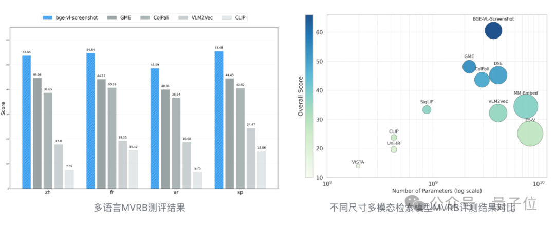BGE-VL-Screenshot在4项任务中表现出色,以60.61的综合得分达到SOTA。在此基础上,通过少量query2screenshot多语言数据训练,模型实现了在英文之外的多语言任务上的出色表现。