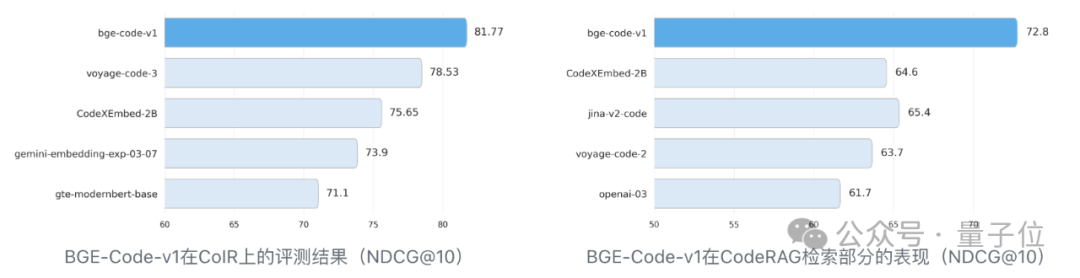CoIR 代码检索基准,收集了覆盖14种编程语言的4大类8个子任务,能够有效地评估模型在自然语言和代码的各类混合场景中的检索能力。CodeRAG-Bench 基准评估了代码检索模型在代码检索增强(RACG)中的表现。BGE-Code-v1在两个基准上均以显著优势超越谷歌、Voyage AI、Salesforce、Jina等商业/开源模型,登顶SOTA。