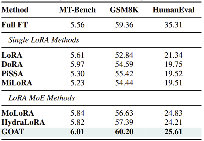 GOAT无需修改模型架构或训练算法,仅通过初始化策略与梯度缩放即可实现性能飞跃,具备极强实用性: