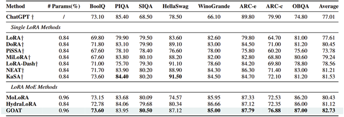 内存占用降低8倍:训练LLaMA7B时,相比全参数微调MoE,GOAT内存需求从640GB压缩至35GB,单卡即可训练;