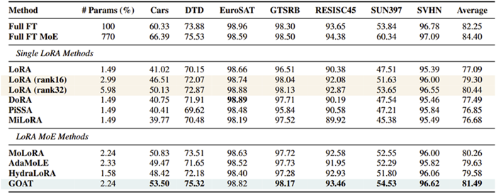 团队在自然语言生成(GSM8K, HumanEval, Mt-Bench)、自然语言理解(GLUE)、常识推理(CommonsenseQA)、图像分类(ImageNet子集)等4个领域25个数据集上验证GOAT的优越性: