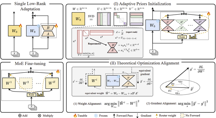利用MoE的动态选择特性,研究人员提出了一种自适应SVD初始化,设计一个LoRA MoE的结构实现收敛速度和最终收敛性能的权衡。