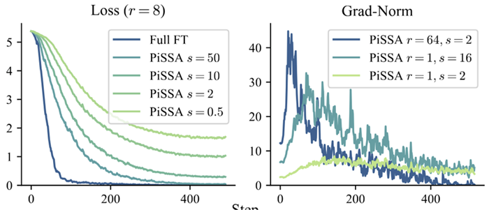 实际使用中,由于忽略了其他的SVD片段,PISSA和MiLoRA的方法并不能保证其有较好的效果,尤其是在秩较低的情况下。