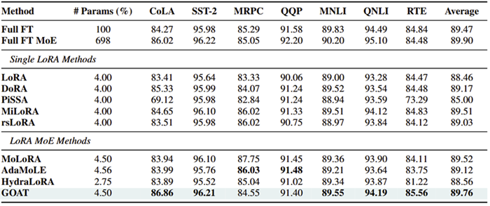 自然语言理解:领先于全量微调,和FT MOE的差距缩小至0.1%;