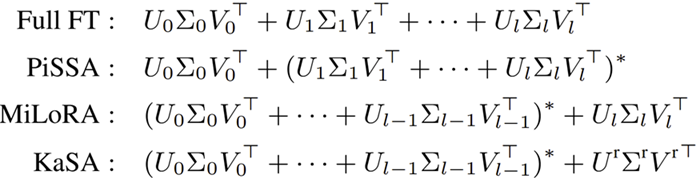先前基于SVD初始化的方法通常会对最大或最小奇异值对应的子空间进行微调:PiSSA仅对具有最大范数的部分进行微调,而MiLoRA和KaSA则冻结较大的分量,对较小的部分进行低秩适应。如图所示: