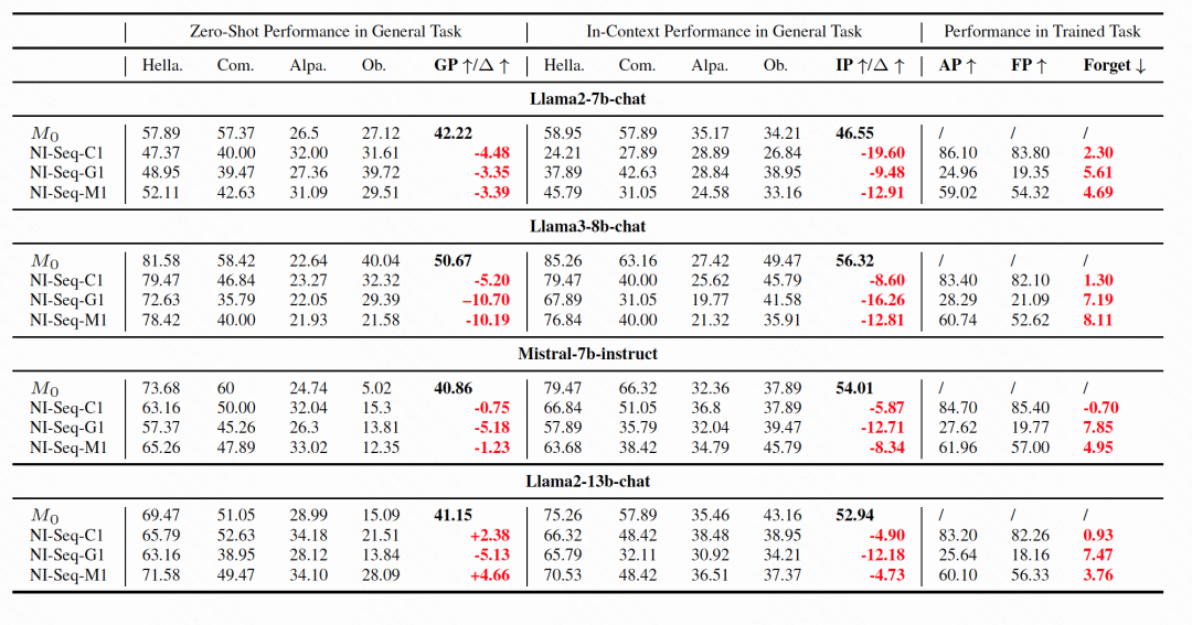 无论是通用任务、新任务,还是上下文能力,都出现不同程度的遗忘。