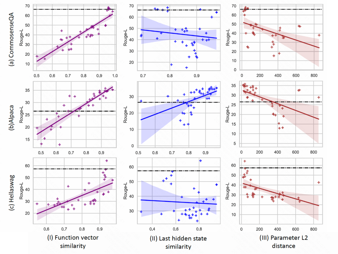 具体而言,在训练NI-Seq-G1数据时Hellaswag的函数向量的相似度与模型性能之间的相关系数(R²值)可以达到0.873。