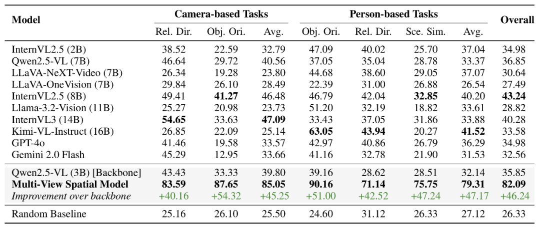 基于构建的 ViewSpatial-Bench,研究团队系统评估了包括GPT-4o、Gemini 2.0、InternVL3、Qwen2.5-VL等在内的十余种主流模型的表现,结果显示: