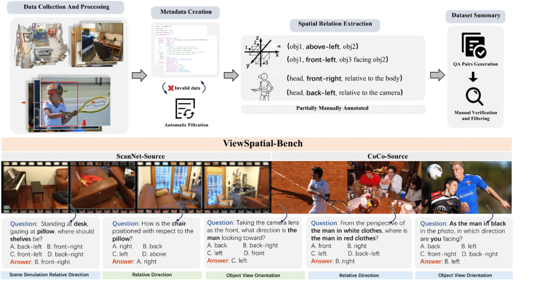 随后基于这些三维坐标或朝向角度计算各类相对空间关系,通过精心设计的自然语言模板自动生成语义明确的问答对,最终经过人工验证确保质量。
