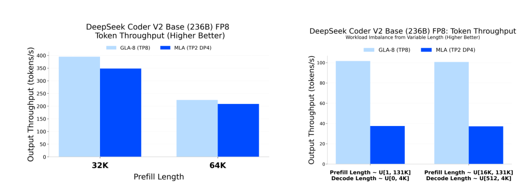 结果显示,在预填充长度为32K和64K时,GLA-8的输出吞吐量明显高于MLA。这表明在处理长上下文时,GLA在吞吐量上优于MLA。