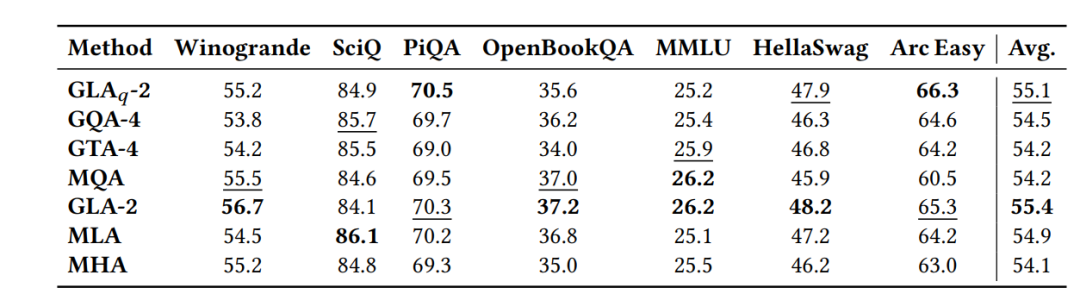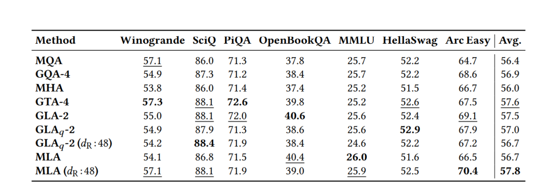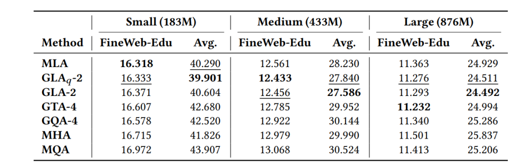 困惑度实验显示,GTA在中大型模型上优于GQA,说明GTA可能更适合模型的进一步扩展;而GLA在多数场景下与MLA相当,说明GLA的设计是合理的,它能在并行计算和模型质量之间找到一个较好的平衡点。