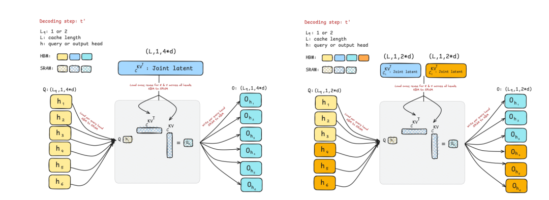 在解码过程中,对比MLA(左图),GLA通过共享联合潜在表示减少了每个设备需要加载的KV缓存量,从而减少了内存访问量。