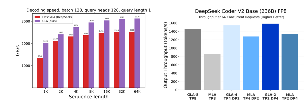此外,在实时服务器性能测试中,对于64个并发请求的输出吞吐量(越高越好),相同并行方案下GLA的表现均优于MLA。