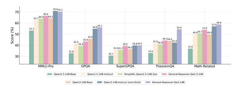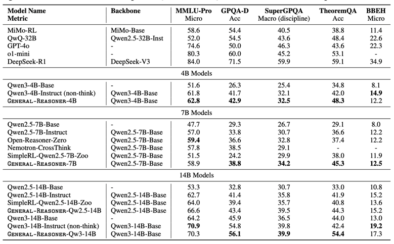 上图显示出General-Reasoner在多项跨领域评测中显著提升基础模型推理能力。