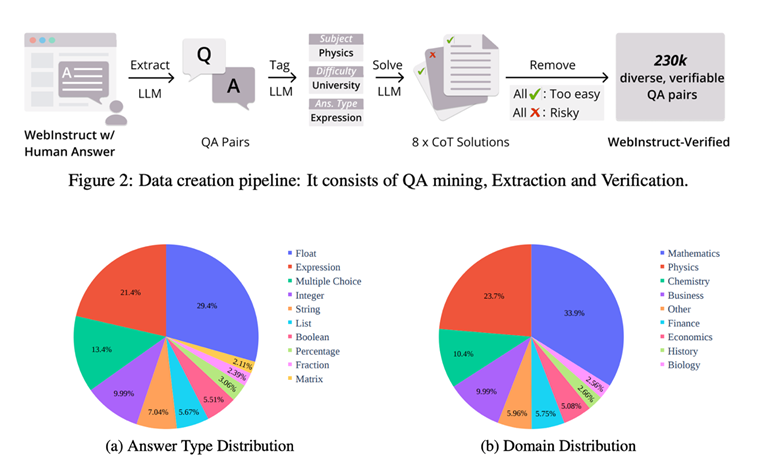 上图为WebInstruct-Verified数据生成过程以及最终答案种类和学科种类的分布