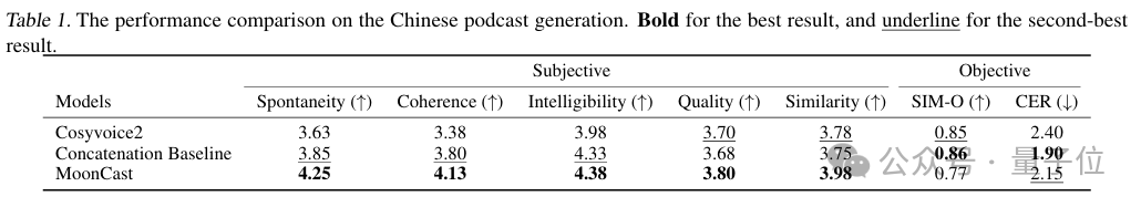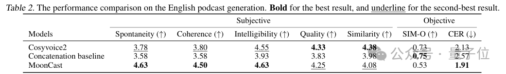 实验证明,MoonCast性能较单句合成模型提升显著,尤其在中英双语长对话播客的自然度和连贯性方面表现惊艳,更接近真人播音效果!