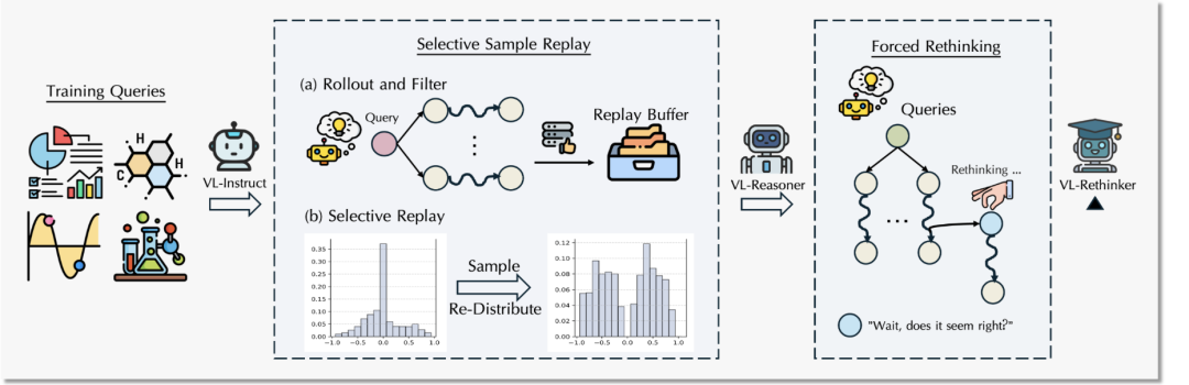 该模型通过「优势样本回放」(Selective Sample Replay)和「强制反思」(Forced Rethinking)两项关键技术,成功激发了VLM的深层推理和自我校准能力。