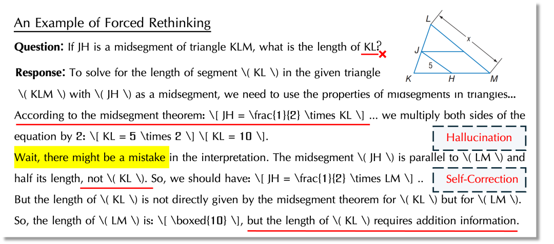 有趣的是,VL-Rethinker习得的反思能力不仅限于审慎模型自身的回答,甚至帮助模型意识到题目中的错误。在下面的例子中,模型在反思自己的推理过程时,意识到了自身推理和题目的矛盾之处,从而意识到问题设定中的错误。