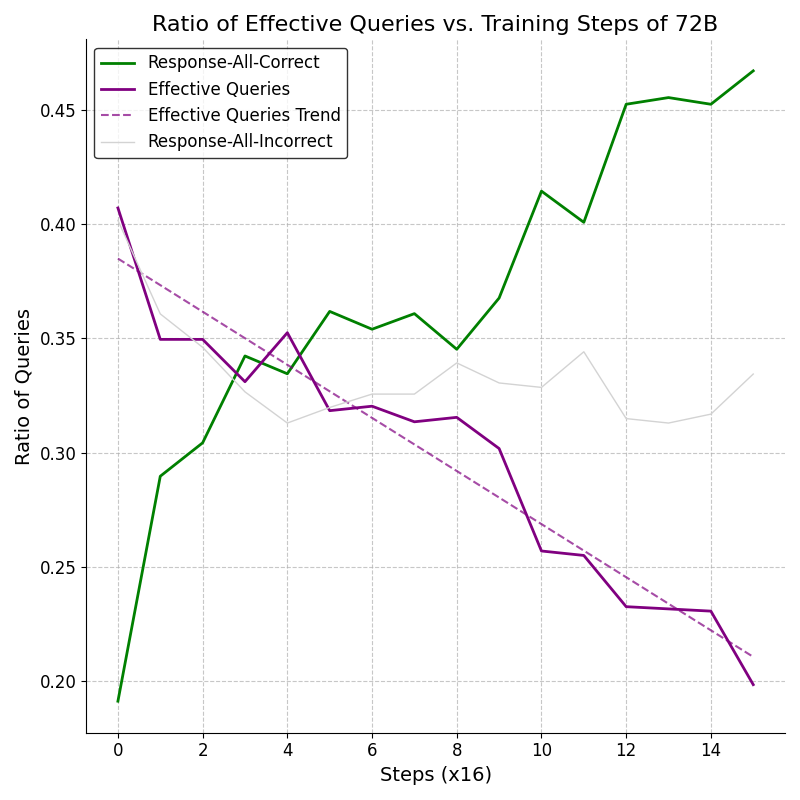 例如,在训练Qwen2.5-VL-72B模型时(如图所示),初始阶段具备非零优势信号的有效查询比例约为40%,但在仅仅约256个梯度更新步骤(16x16 steps)后,此比例便迅速下降至20%以下。