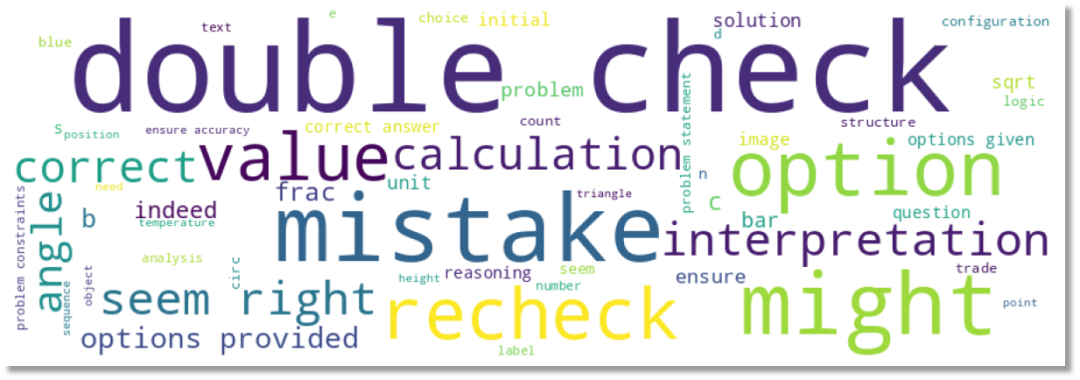 为了克服VLM的「反思惰性」,研究团队提出了「强制反思」机制:当模型生成初步回答后,人为地追加一个特定的“反思触发”文本,强制模型启动二次推理流程。研究团队设计了包括自我验证、自我纠错和自我提问等多种类型的反思触发器,以引导模型学习并生成多样化的反思行为(如词云中所示)。训练样本中,进行强制反思的回答只对正确的部分进行保留。