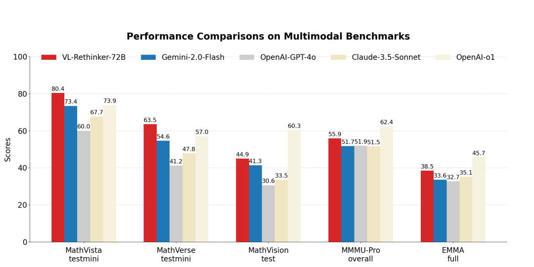 VL-Rethinker-72B 相较于基座模型 Qwen2.5-VL-72B,在 MathVista 上提升 5.6%,在 MathVerse 上提升 6.3%;
