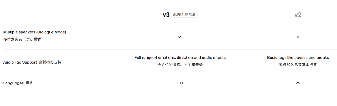 总之,和之前的v2版本相比,v3新增了多人对话功能,还提供了更多音频标签和语言选择。