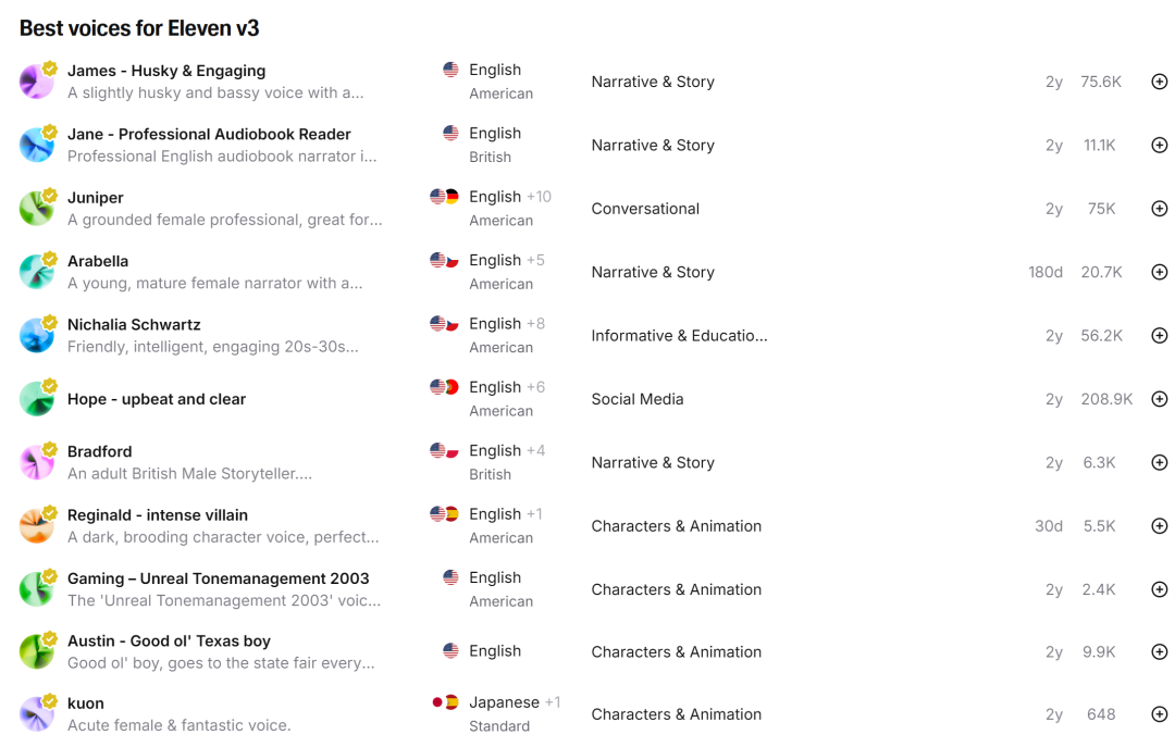 对此,Eleven v3当前提供了“22位优秀配音老师”,他们基本上都是美国人和英国人,其音色适合不同配音场景。