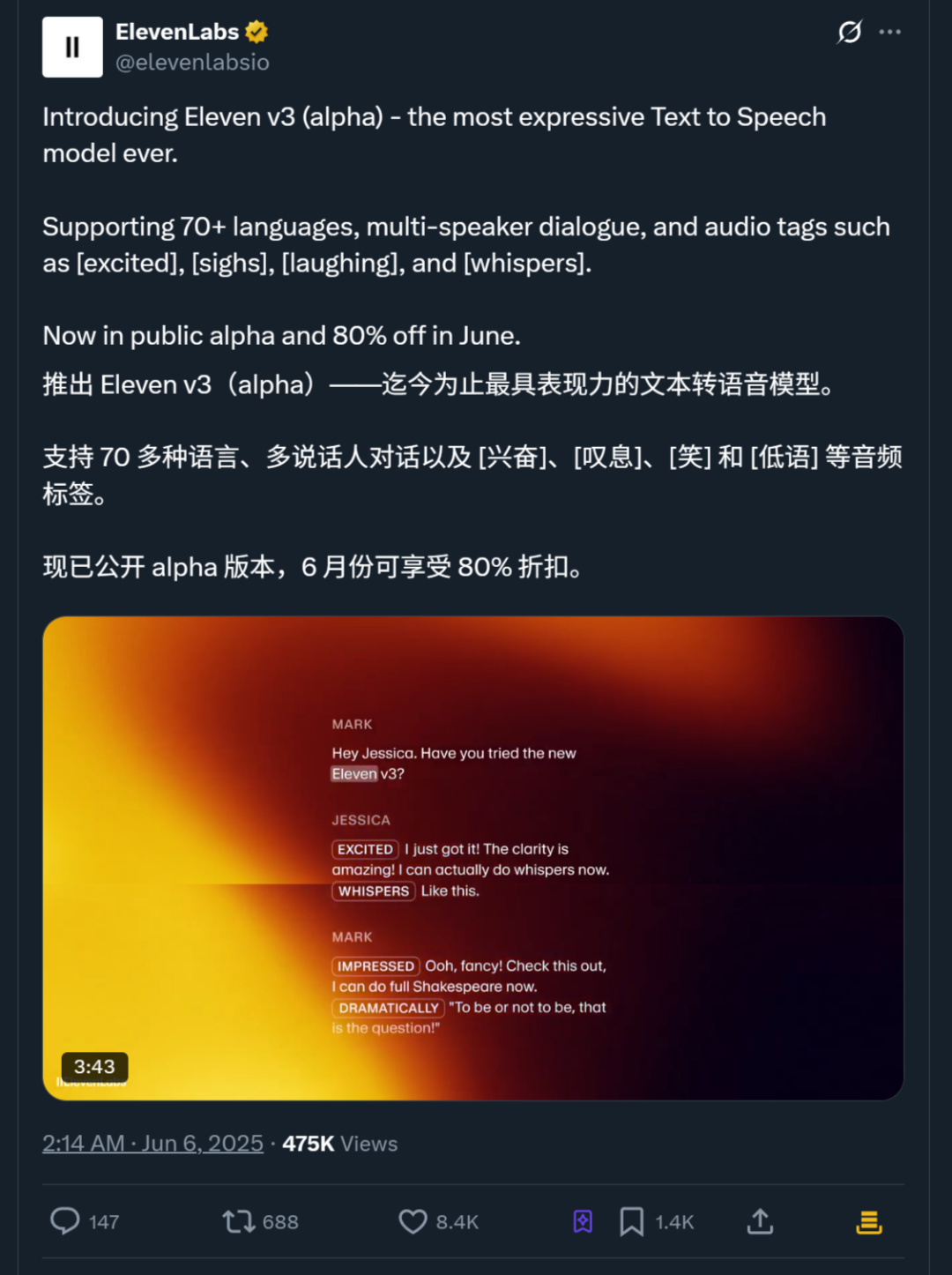 就在刚刚,专攻AI语音合成的独角兽ElevenLabs发布旗下最新版TTS模型——Eleven v3。