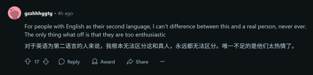 对于英语为第二语言的人来说,根本无法区分AI和真人,唯一不足的是他们太热情了!
